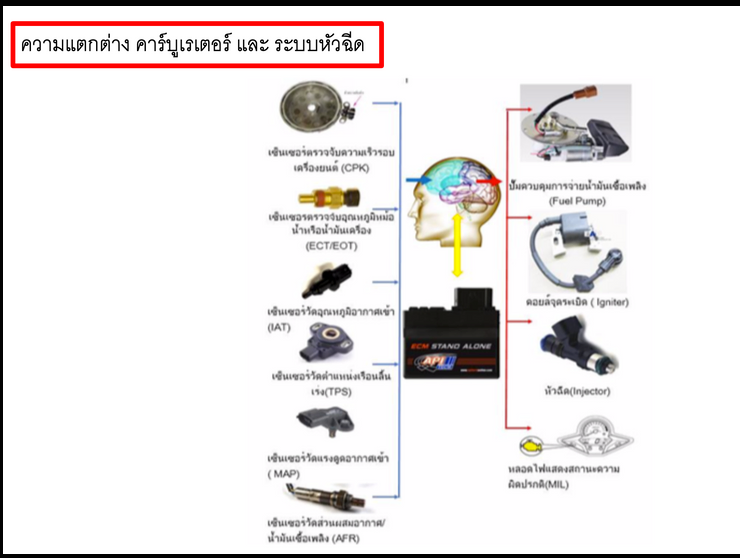 โดยทั้งหมดนี้จะเป็นระบบหลัก ในการทำงานของเครื่องยนต์ กับรถจักรยานยนต์หัวฉีด โดยระบบทั้งหมดสื่อสารกันด้วยการจ่ายกระแสไฟ(ที่มีค่าเป็นตัวเลข) ไปบอกกล่อง ECM เพื่อกำหนดการทำงานระบบอิเล็กทรอนิกส์ต่างๆ ของกล่อง ECM ตามที่ทางผู้ผลิตได้ออกแบบมา ให้เครื่องยนต์ทำงานได้อย่างเต็มประสิทธิ์ภาพแต่เมื่อการใช้งานไปได้ตามระยะหนึ่งแล้ว อุปกรณ์ต่างๆเกิดความเสริม หรือมีเซ็นเซอร์ตัวไหนผิดปกติไป ก็จะทำให้กล่อง ECM ทำงานผิดพลาด แน่นอนเรื่องนี้ต้องเรียนรู้กันยาวๆ ค่อยๆ ทำความเข้าใจ ตามช่องทางที่ให้ไว้