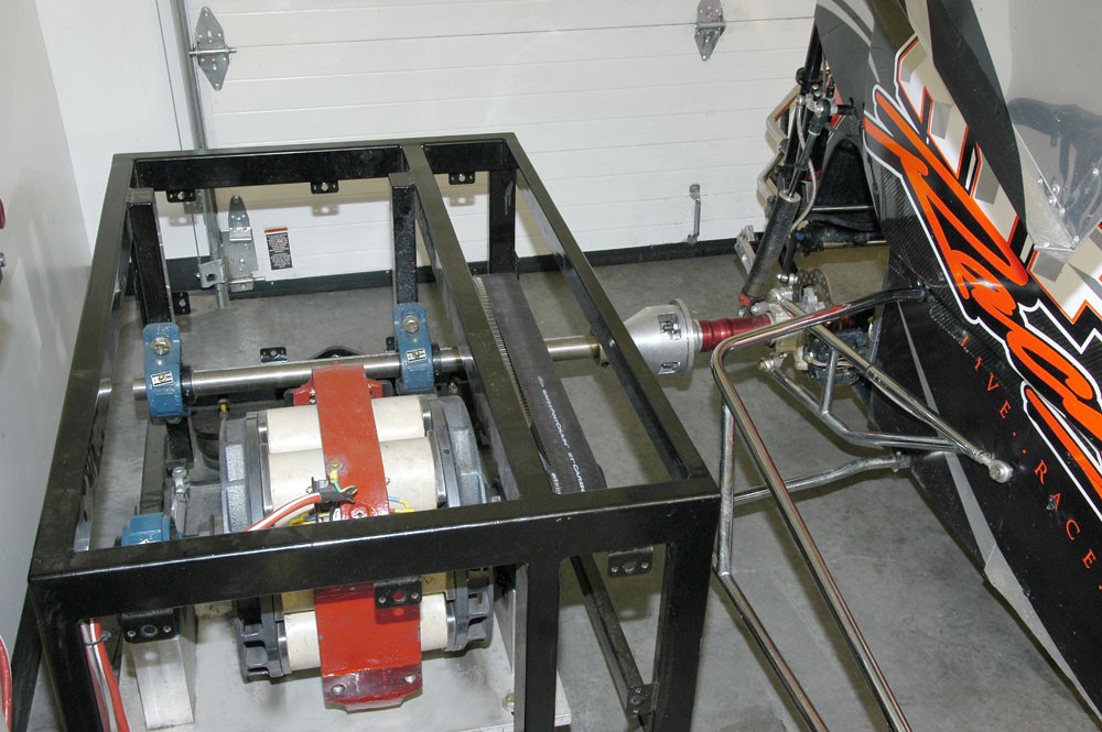 2. Chassis Dynamometer เป็น Dyno ที่วัดกำลังงานของเครื่องยนต์ที่มีการถ่ายทอดกำลังงานผ่านเกียร์และเพลาขับหรือเฟืองท้ายมาแล้ว การทดสอบจะต้องถอดล้อคู่หน้าหรือหลังที่เป็นล้อขับเคลื่อนออก เพื่อทำการสวมอะแดปเตอร์ของ Dyno เข้ากับเพลาDyno ประเภทนี้มีข้อดีในเรื่องของความปลอดภัย และสามารถจำลองโหลดในสภาวะต่างๆ ได้แต่มีข้อเสียคือ ใช้เวลาในการทดสอบมาก เพราะต้องถอด – ใส่ล้อ และการจัดตำแหน่งการติดตั้งอุปกรณ์