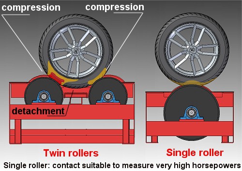 เมื่อเปรียบเทียบแล้วจะเห็นได้ว่า ระหว่าง Twin rollers(2 ลูกกลิ้ง) กับ Single roller (ลูกกลิ้งเดี่ยว) มีความแตกต่างกันที่ล้อ ส่วนหลักการทดสอบนั้นภาพด้านบน อธิบายถึง Twin rollers(2 ลูกกลิ้ง)จะมีแรงกดและหน้าสัมผัสที่ล้อมากกว่า แบบ Single roller (ลูกกลิ้งเดี่ยว) เพราะฉะนั้น Single roller (ลูกกลิ้งเดี่ยว)เหมาะสมกับรถที่แรงม้าสูง และมีความเสถียรกว่าแบบ 2 ลูกกลิ้ง